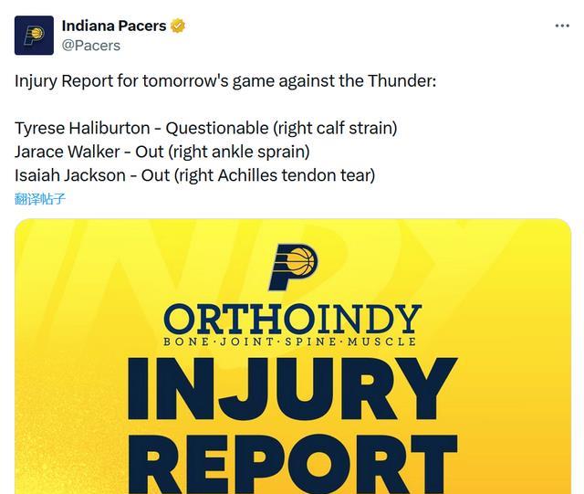 在步行者队的官方伤病报告中,哈利伯顿的状态为出战成疑。